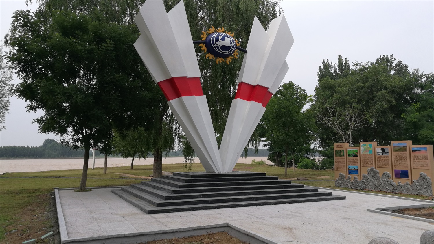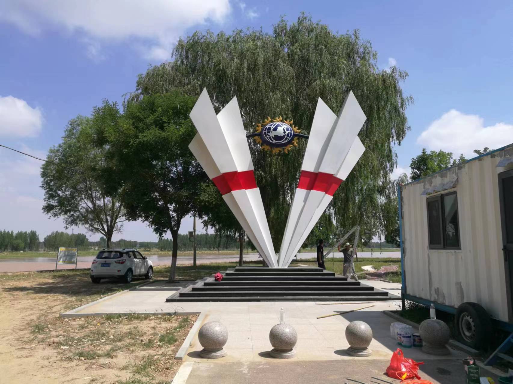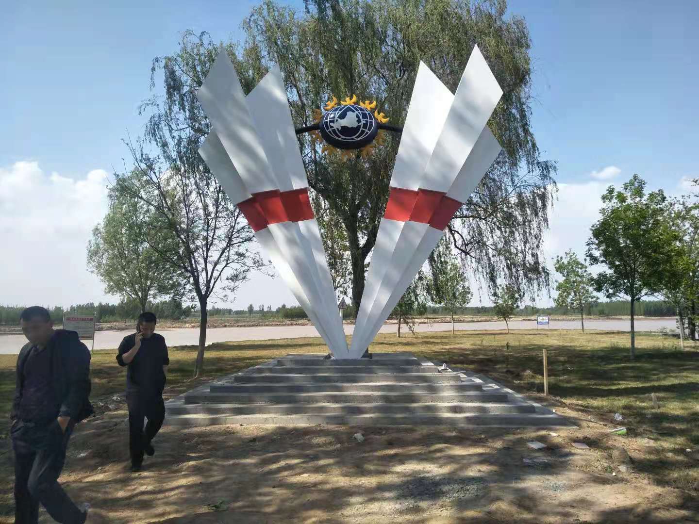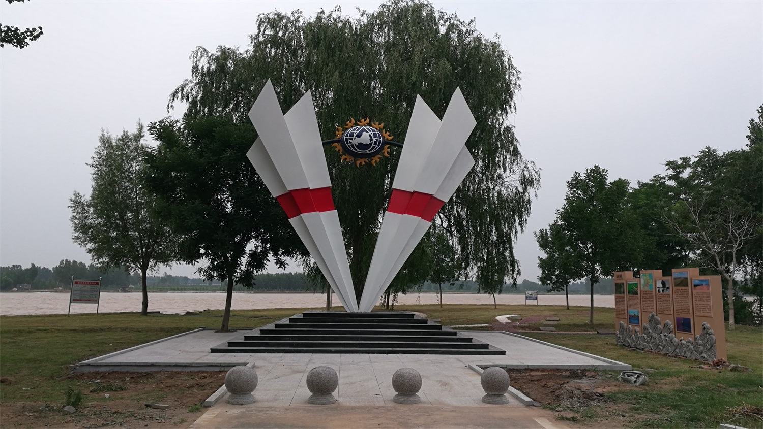 雕塑整體呈扇形構(gòu)造,代表黃河三角洲扇形外貌;兩側(cè)形似利劍,寓意治黃工作者敢于“亮劍”的拼搏精神; 中間球形,寓頂點(diǎn)之意;其上印制有黃河水利委員會標(biāo)志,圍繞十只和平鴿。寓意以治黃事業(yè)為中心、人民幸福、和平安寧、生態(tài)保護(hù)、空間均衡;主體色彩以紅、黃、藍(lán)搭配。紅色代表黨建引領(lǐng),黃、藍(lán)象征海河交匯。寓意治黃事業(yè)在中國共產(chǎn)領(lǐng)導(dǎo)下開創(chuàng)新篇章。