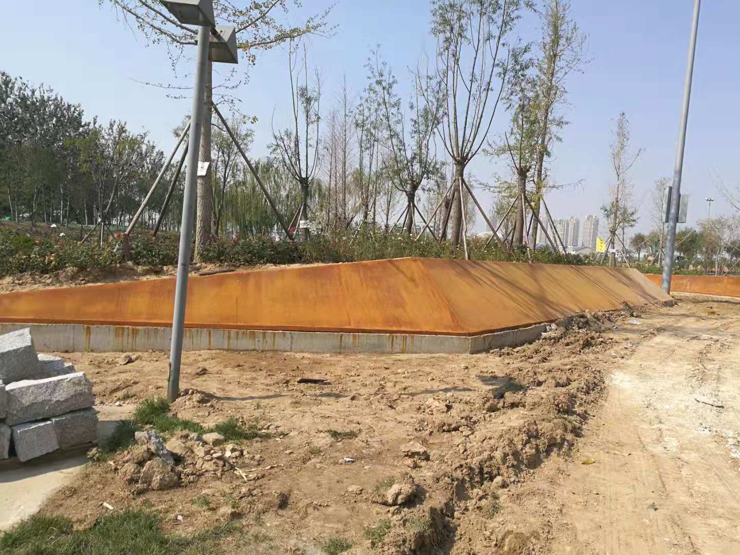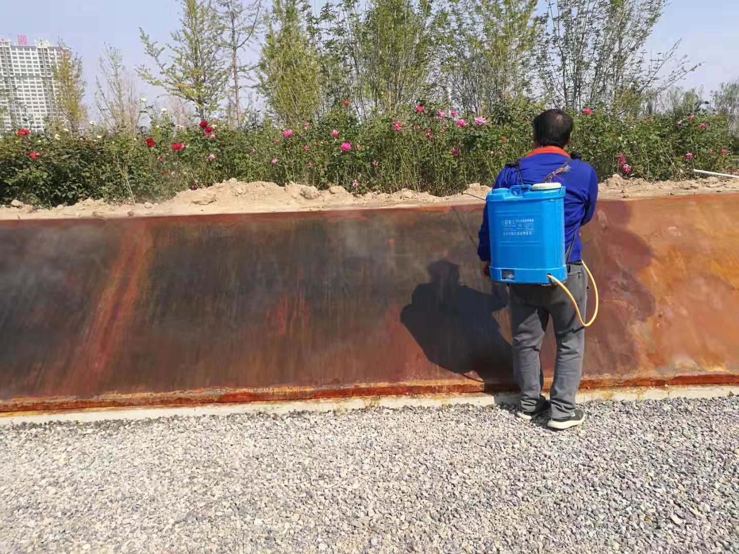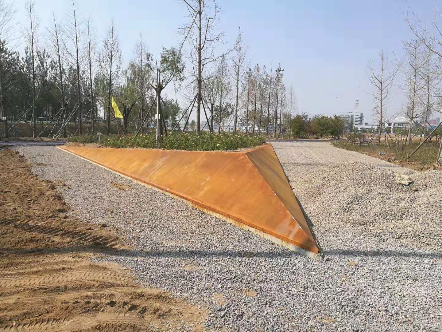 中海植物園即原來的中海景區(qū)東北角的原高爾夫球場區(qū)域,2018年改造升級為濱州中海植物園。所施工的銹板花池共7組,造型表面積共488平方米。造型板采用5mm厚銹板,支撐采用80mm*50mm*2.5mm的U形鋼。采用專業(yè)的耐候鋼生銹劑及固銹劑做表面處理。生銹的初期會呈黃色,然后隨著生銹進程的推移,逐漸顯現(xiàn)金黃色,橙黃色,橙色,橙紅,紅褐色最后在紅褐,或者褐色穩(wěn)定下來。